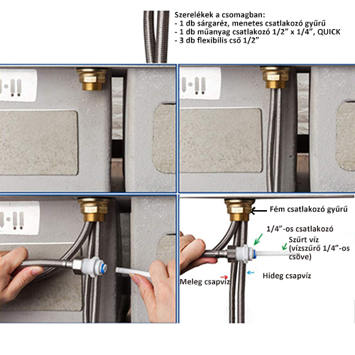 - flexibilis csőcsatlakozások mérete: hideg és meleg víz - 3/8" (hollander), RO víz - 1/2" belsőmenet (1/2" külsőmenetx1/4" Quick gyorscsatlakozó idom a csomagban)