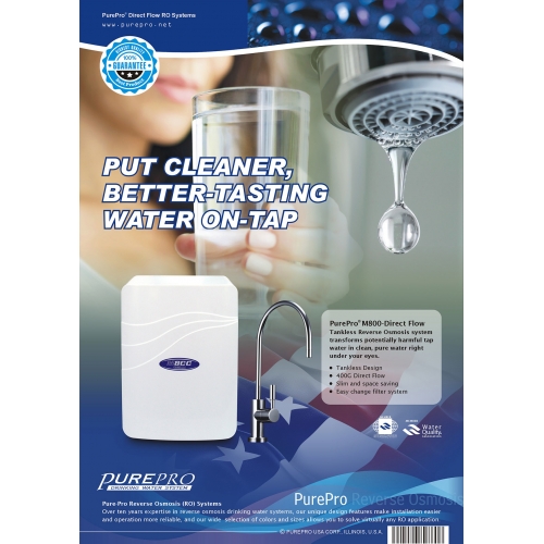 A PurePro M800DF fordított ozmózis membránt tartalmazó, hálózati víz utótisztító kisberendezés a konyhai mosogató alá, a vízhálózatra szerelhető, 5 szűrő-lépcsős, kompakt kivitelű, dizájn dobozos készülék, tartály nélküli (ún. "direct flow" rendszerű) kivitelben. A szűrőházakba épített szűrők, ún. kompakt szűrőegységek előnye, hogy a szűrők cseréje szűrőházakkal együtt, szerszám nélkül könnyedén megoldható. A készülék jellemzője még, hogy a víztisztító egy tetszetős műanyag dobozban van elhelyezve, továbbá, hogy a kompakt kivitelű szűrőegységeknek és a tartály hiányának köszönhetően egészen kicsi a berendezés helyigénye. Működéséhez elektromos csatlakozásra van szükség.