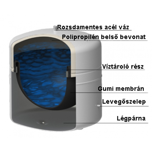 2. Nyomás kialakulása: a tartályban egy légpárna is található, amely összenyomódik a víz beáramlásával, így nyomás keletkezik a tartályban.