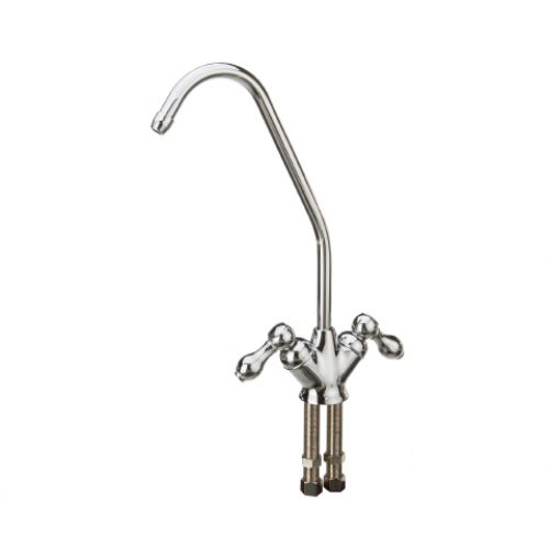 Pultra (mosogatótálca mellé) szerelhető, kétutas (pl. lágy-sózatlan RO vízhez és visszasózott RO vízhez), kerámiabetétes csaptelep RO víztisztítókhoz, klasszikus, döntött kivitelben.